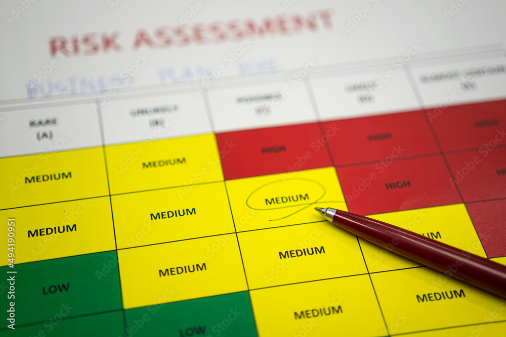 A pen is placed on paper with marked on medium level of the project risk assessment evaluation form. Business and finance concept photo. Selective focus.