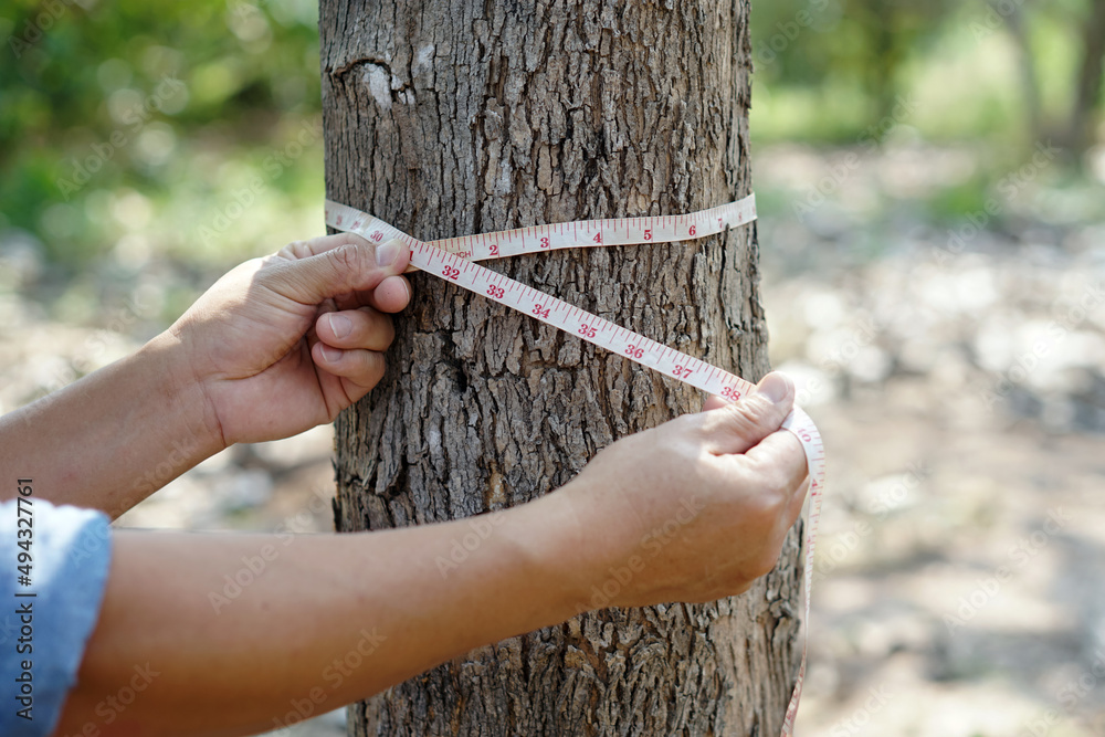 Botanist's hand is measuring trunk of tree to analysis and research about growth of tree. Concept : forest valuation. Conservation of environment. Selective focus.