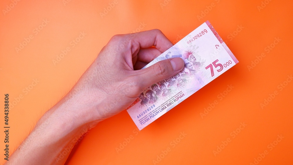 Indonesian Rupiah the official currency of Indonesia. Man's hand is making a payment. Male hand showing Indonesian Rupiah note. Business Investment Economy Loan and Finance concept. Uang 75.000 Rupiah