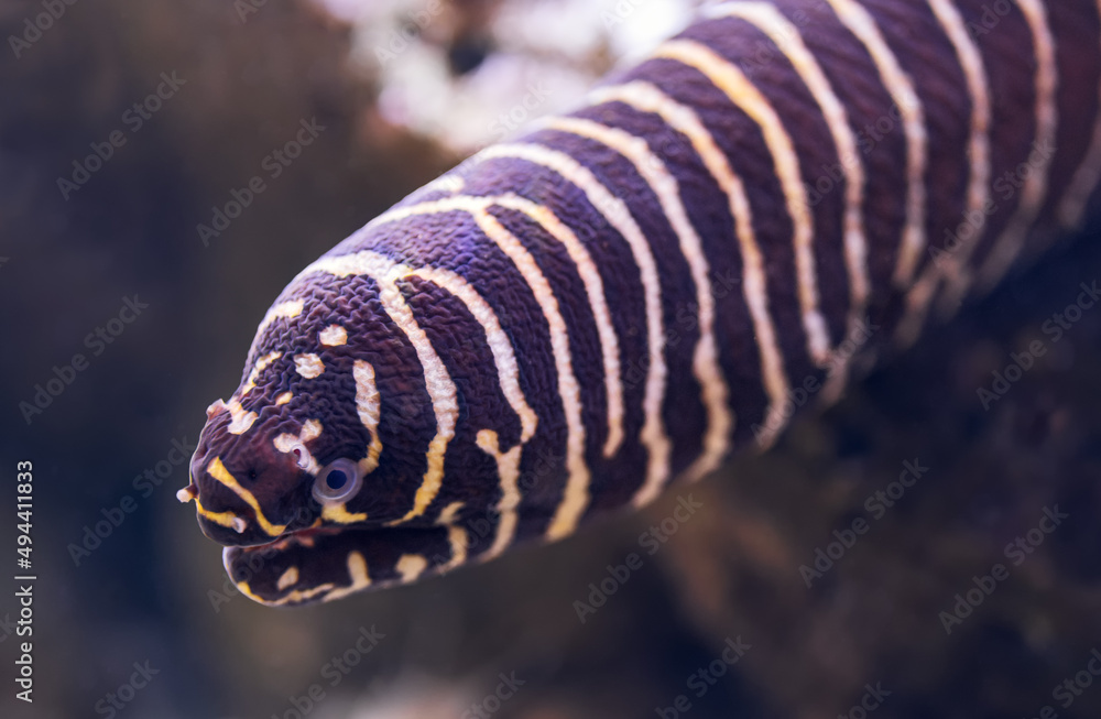 Close-up view of a zebra moray (Gymnomuraena zebra)