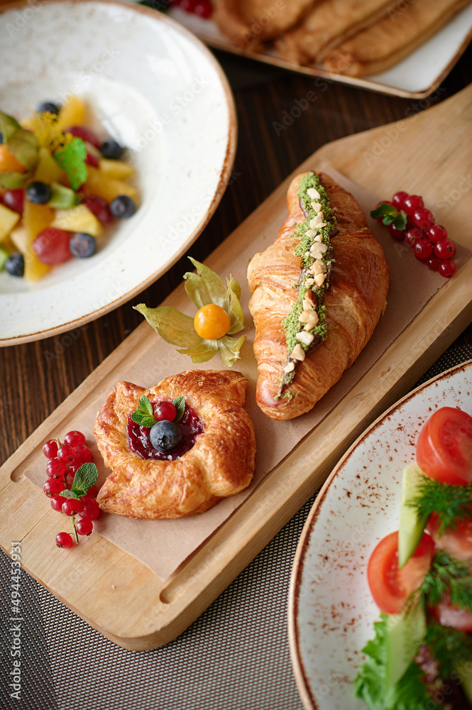 Vertical photography with bakery and fruit salad on the wooden board,decorated with physalis.
