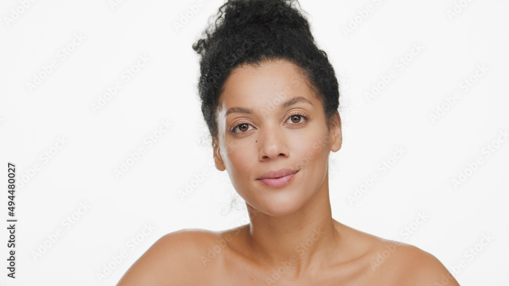 Close-up beauty portrait of young attractive African American woman with bun hairstyle looks at camera on white background | Face care concept