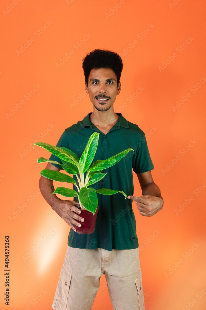 Earth Day - Handsome young black man with green shirt holding plant isolated on orange background.