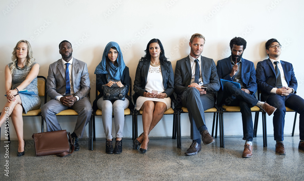 Hoping to make a memorable impression. Shot of a group of well-dressed businesspeople seated in line while waiting to be interviewed.