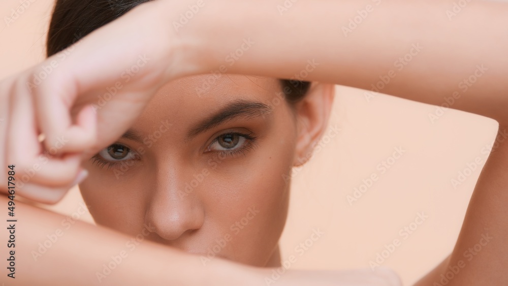 Beauty model touches her hand skin with a finger and looking through all this at the camera | Perfect skin and skin care concept.