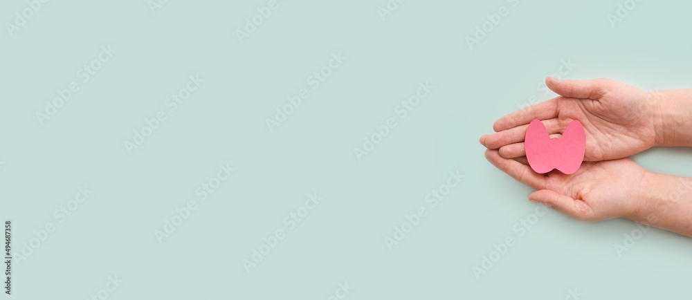 World Thyroid Day. Women's hands hold a paper form of the thyroid gland on a blue background. Problems with thyroid. Polycystic disease. World cancer day. copy space. banner
