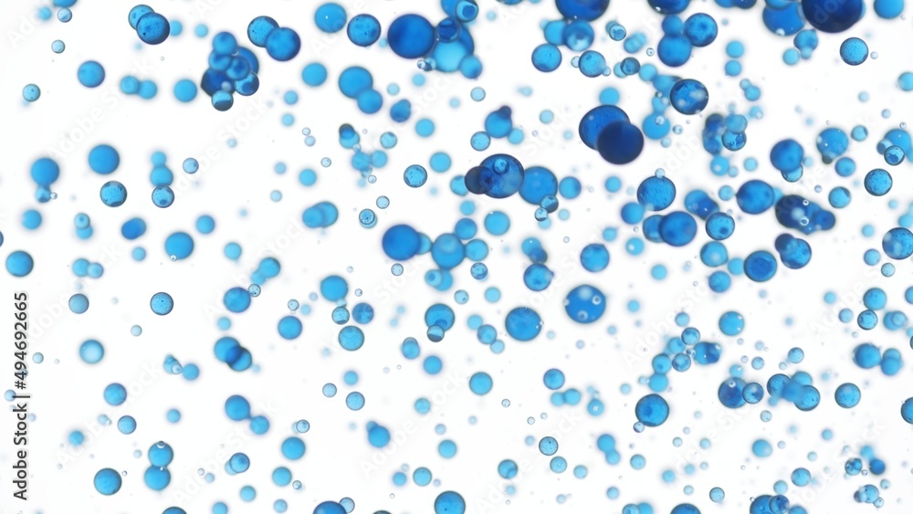 Blue tansy oil is poured into the water creating a lot of different sized clear blue bubbles on white background | Abstract background