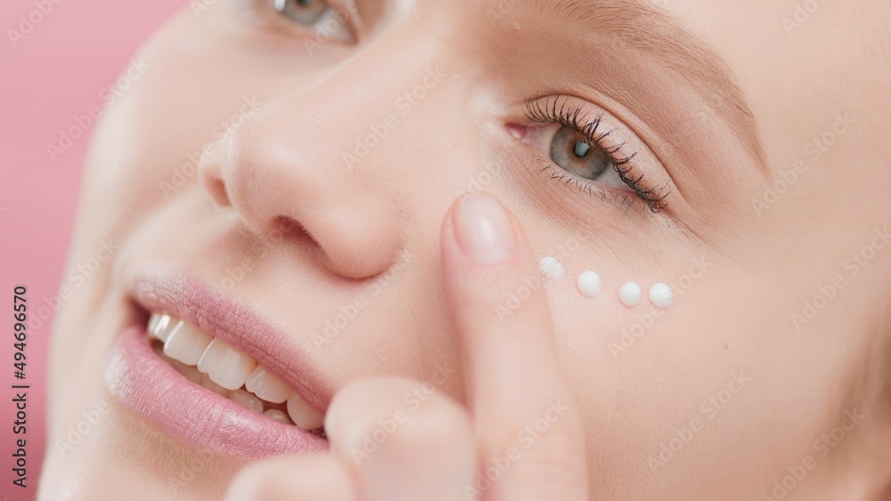 Extreme close-up shot of good-looking Caucasian woman who applies cream under her eye against pink background | Eye cream application and face care commercial concept