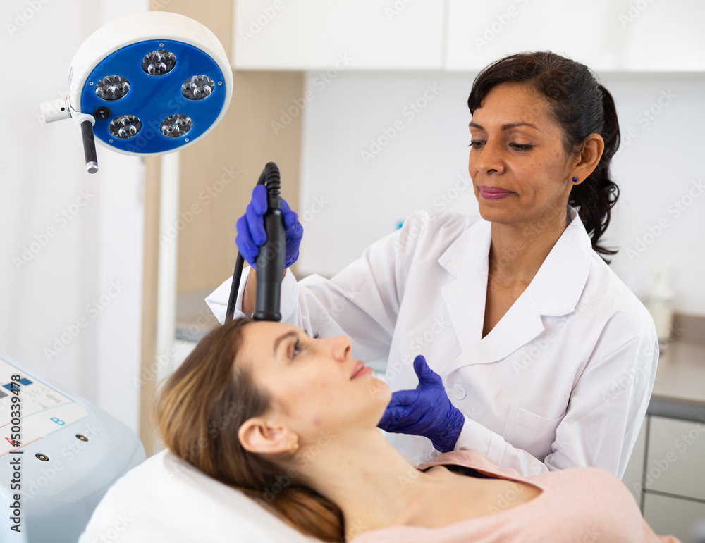 Portrait of a beautiful young woman lawyer sitting at a desk in a lawyer's office.