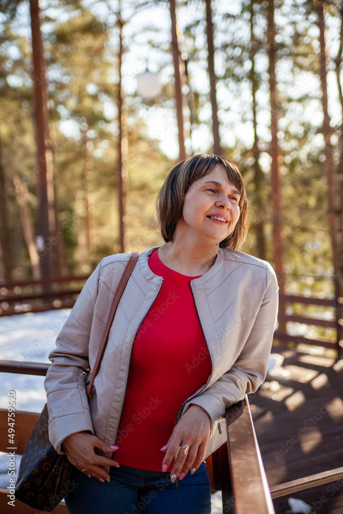 Contemplative casual mature woman in spring park