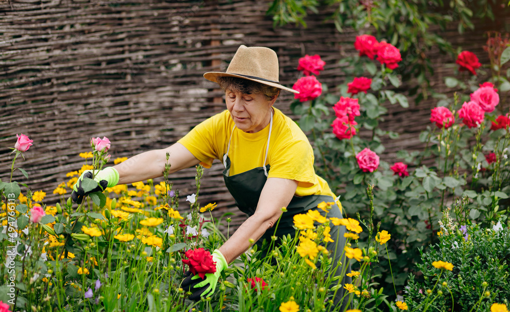 Senior woman gardener in a hat working in her yard and trimming flowers with secateurs. The concept of gardening, growing and caring for flowers and plants.