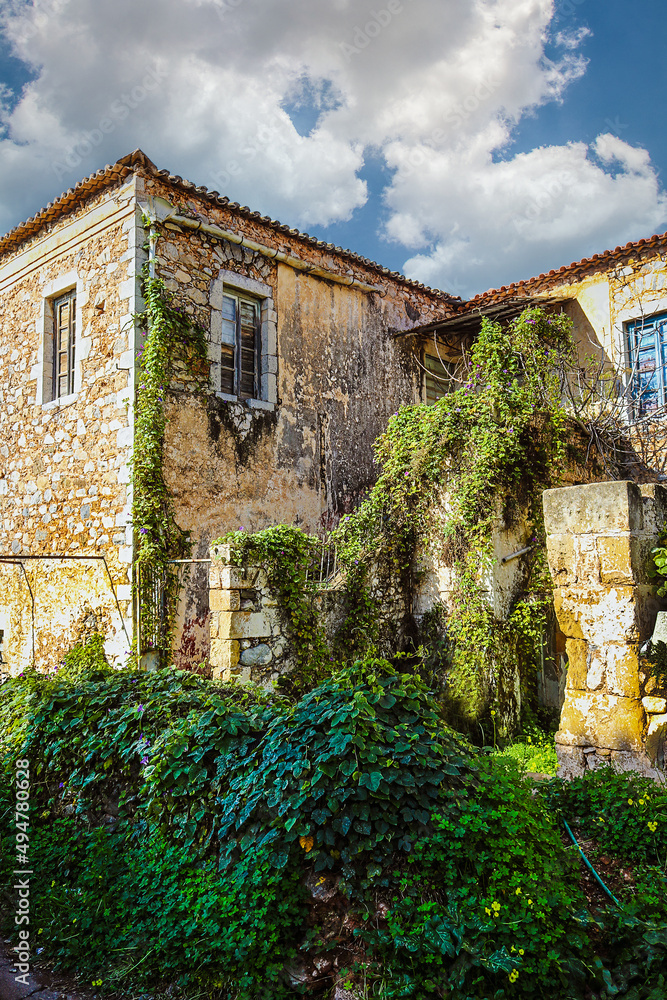 Two story ancient rustic rock and stucco building overgrown with vines in Greek village of Kardamyl