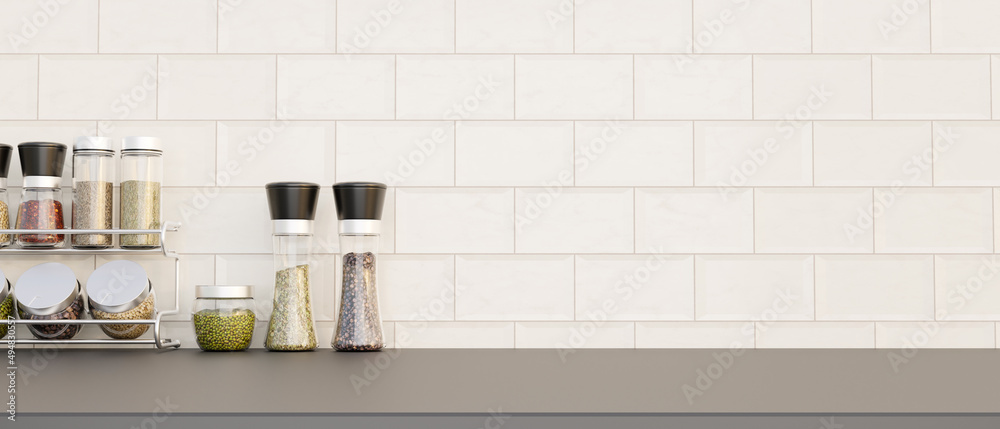 Set of spice bottles or seasoning bottles and copy space on kitchen countertop