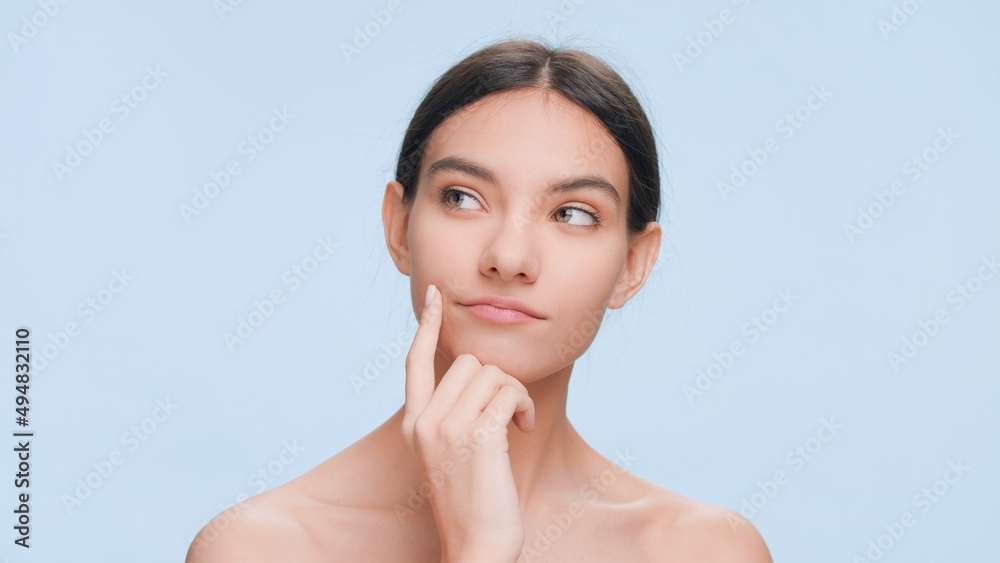 Young fresh looking beauty model with pure skin thinking and got an idea | skin care and beauty care concept