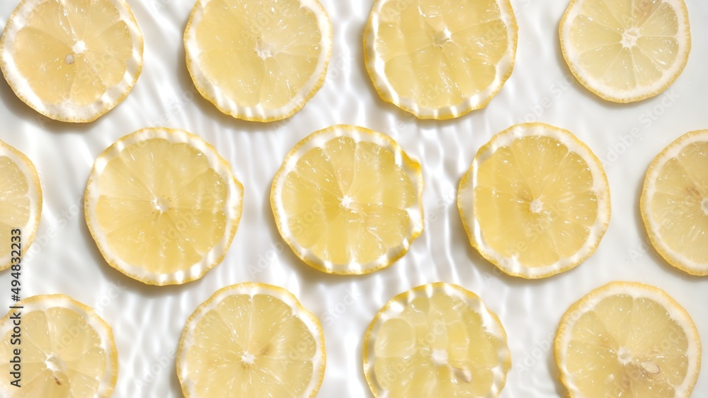 Wave flowing on water surface and making ripples over lemon slices arranged in lines on white background | cosmetic background, face oil commercial concept