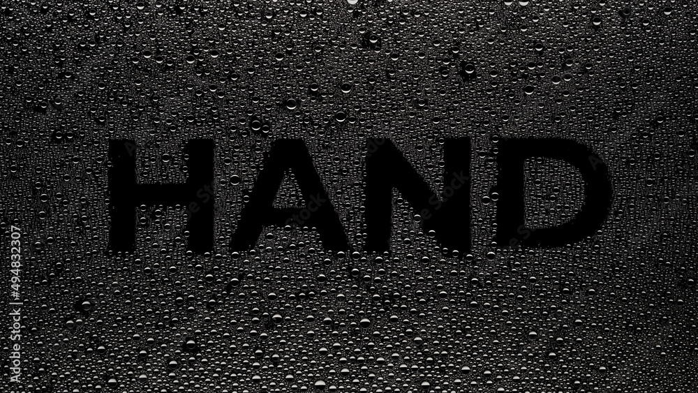 Word hand printed on the wet glass on black background | hand moisturizing concept