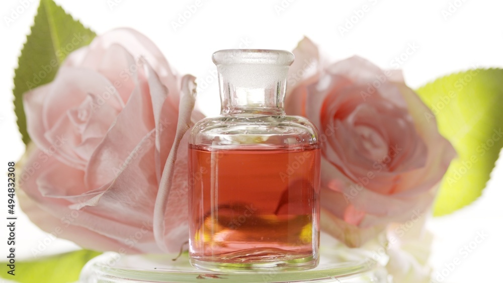Drops of rose water fall into old fashioned reagent bottle in front of two pink roses on white background | Abstract body care cosmetics with rose water formulation concept