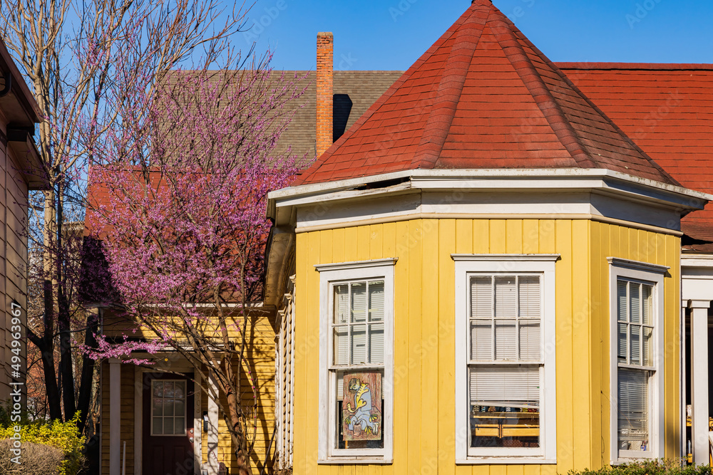 Close up shot of eastern redbud blossom in front of a cute historical house