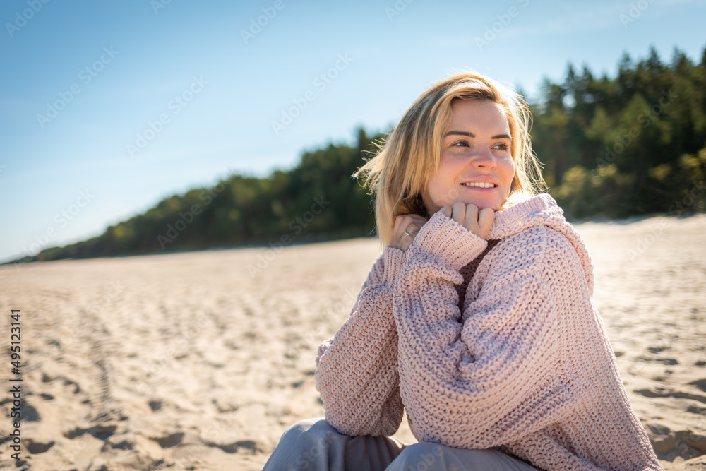 Charming young woman in knitted sweater sitting on sandy beach at sunny day