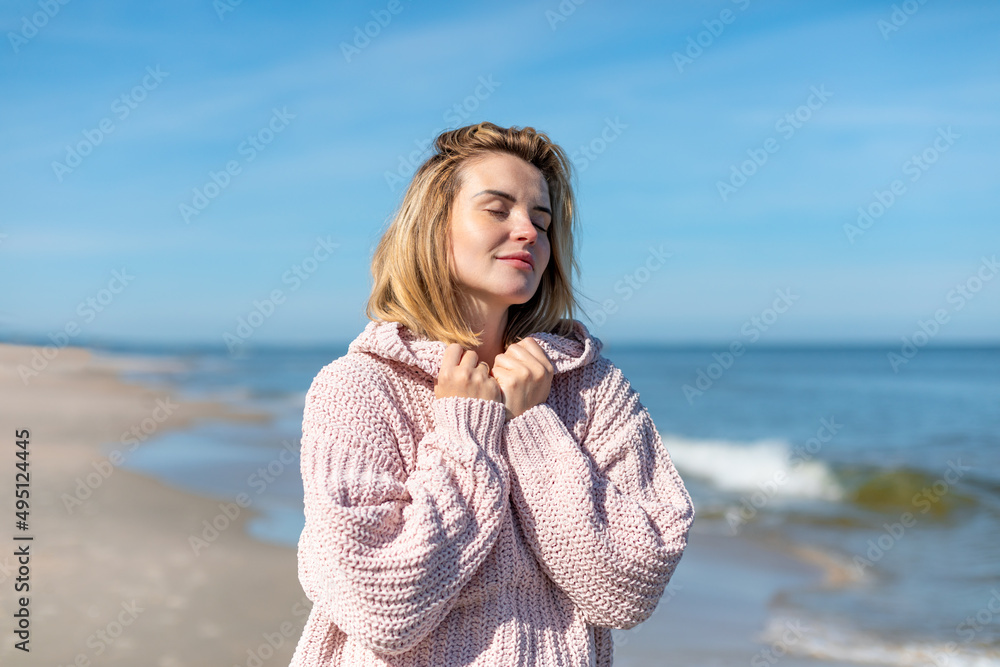 Woman in sweater enjoys the sun on a cold day at the beach