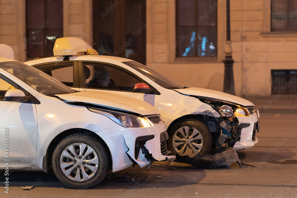 Two cars on the city road after collision. Damaged white automobile on the street after the accident with damaged bumpers, side view.