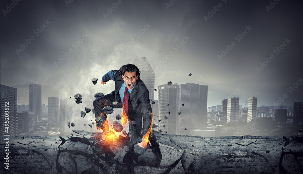 Determined businessman leaving fire trails on asphalt . Mixed media