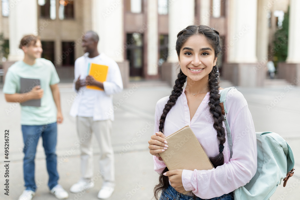 Loans for education concept. Portrait of happy indian female student posing outdoors in campus with her classmates