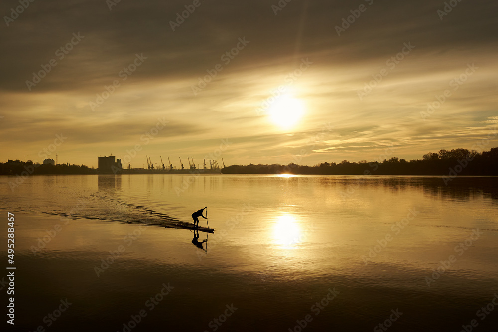River landscape with silhouette of a teenager boy paddle on stand up paddle boarding (SUP) at sunrise on quiet surface of autumn Danube river. Morning training and meditation on the water