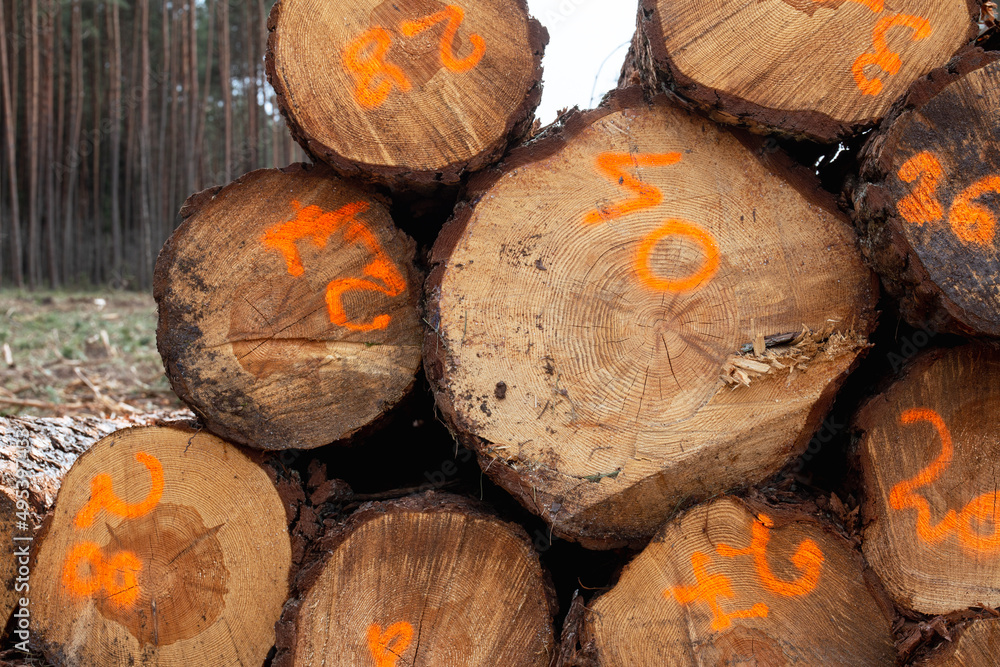Freshly made firewood in the evergreen forest, pine tree logs close-up. Environmental damage, ecological issues, ecology, nature, wood, deforestation, alternative energy, lumber industry, business