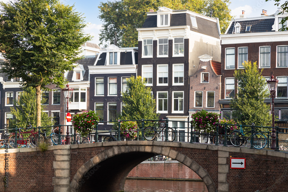 Canal with bridge and historic canal houses in the center of Amsterdam.