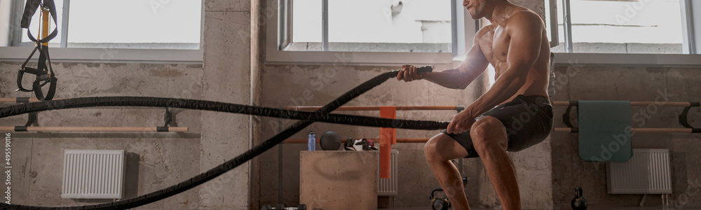 Side view of handsome physically fit male working out with heavy ropes in cross fit gym