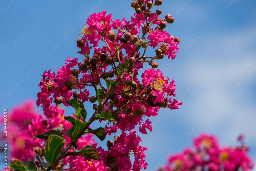 Bright pink flowers blossom of Сrape myrtle tree (Lagerstroemia indica) on blue sky background in city park Krasnodar. Close-up selective focus with copy space. Public landscape Galitsky park