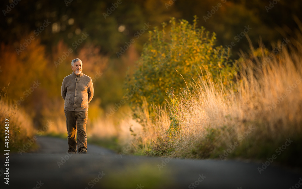 Portrait of handsome senior man in the autumn outdoors. Active senioor enjoying his retirement in the nature
