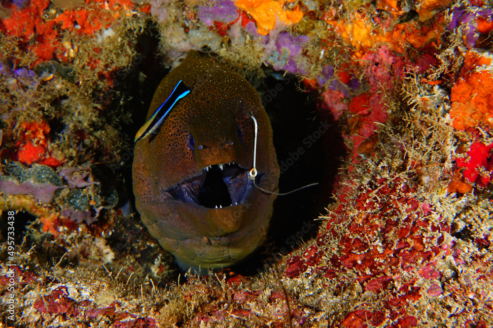 Closeup of a moray eel underwater in Malaysia