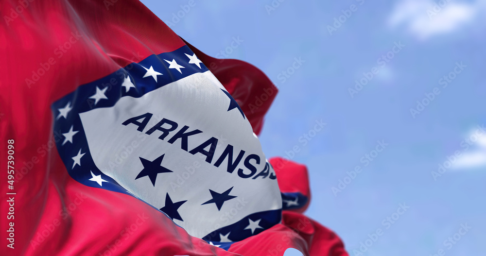 The state flag of Arkansas waving in the wind