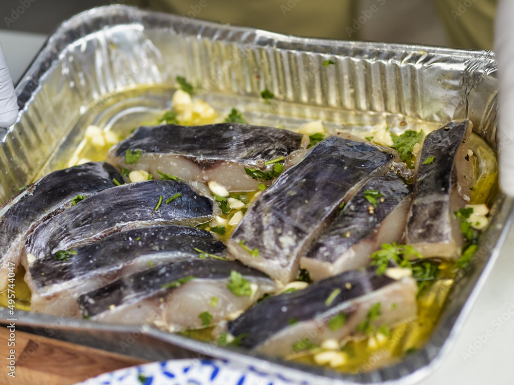 Closeup shot of an aluminum foil tray with fish slices