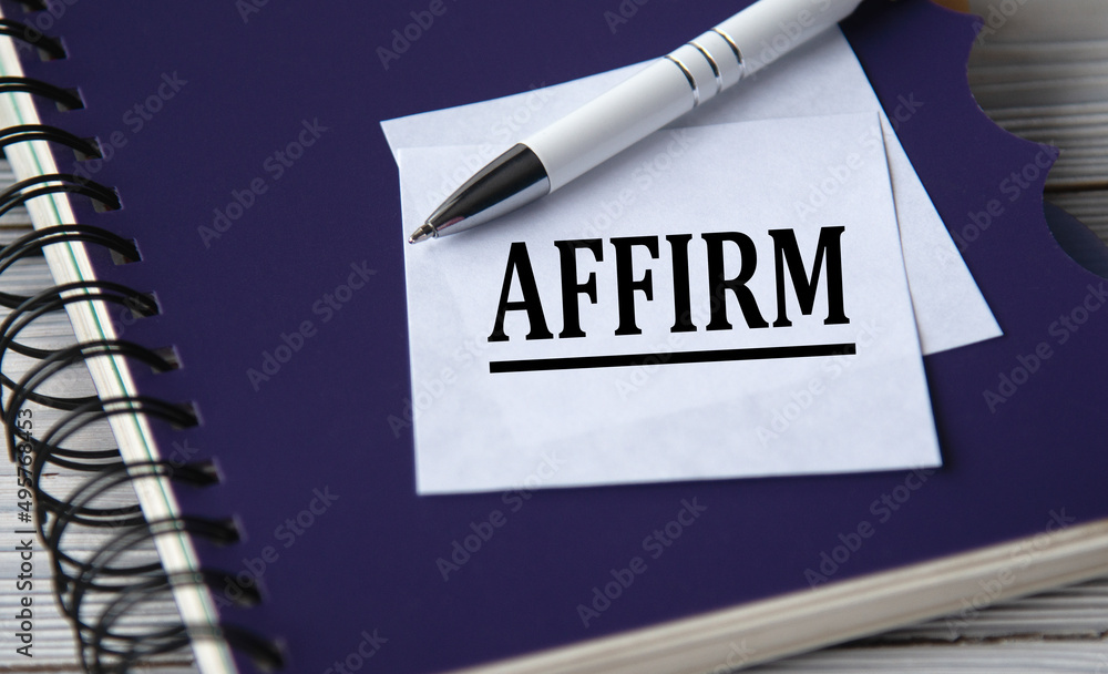 AFFIRM - word in a white notebook against the background of a black notebook with a pen