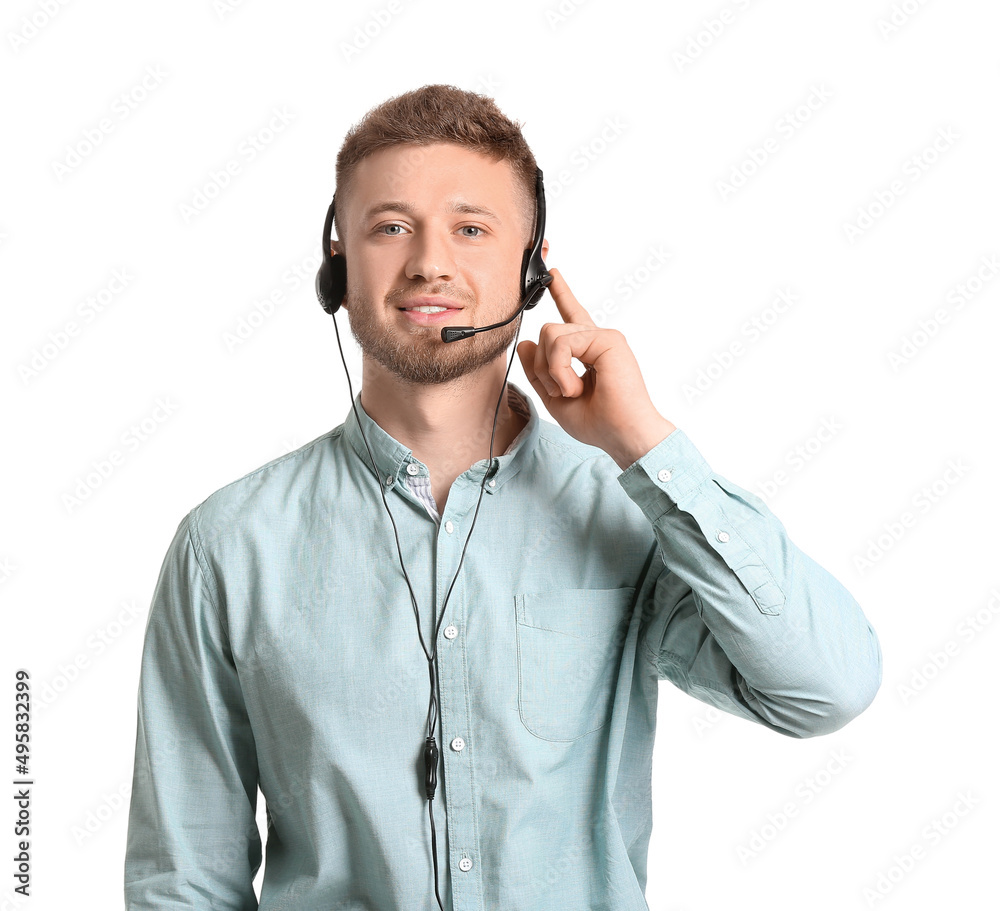 Male consultant of call center in headset on white background