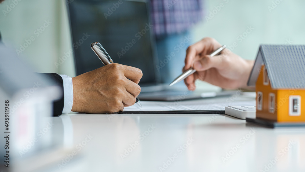 Real estate agent with house model hand putting signing contract, hands holding pen to sign a contract close up.