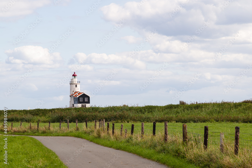 Country road with a view of a white lighthouse on the Dutch peninsula Marken.