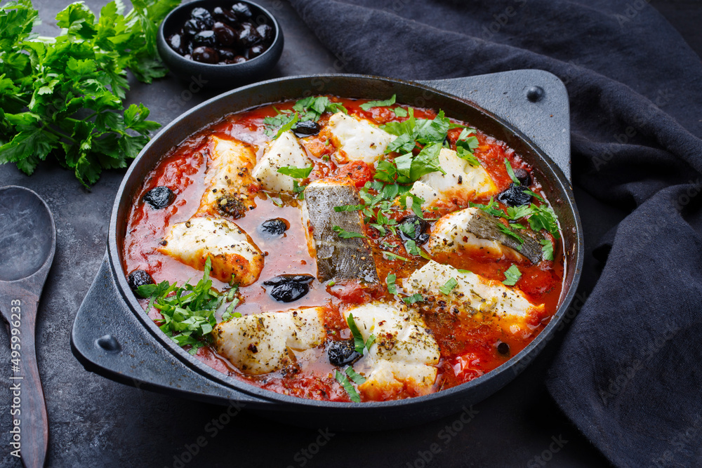 Traditional Spanish seafood zarzuela de pescado with fish served in red sauce as close-up in design pot