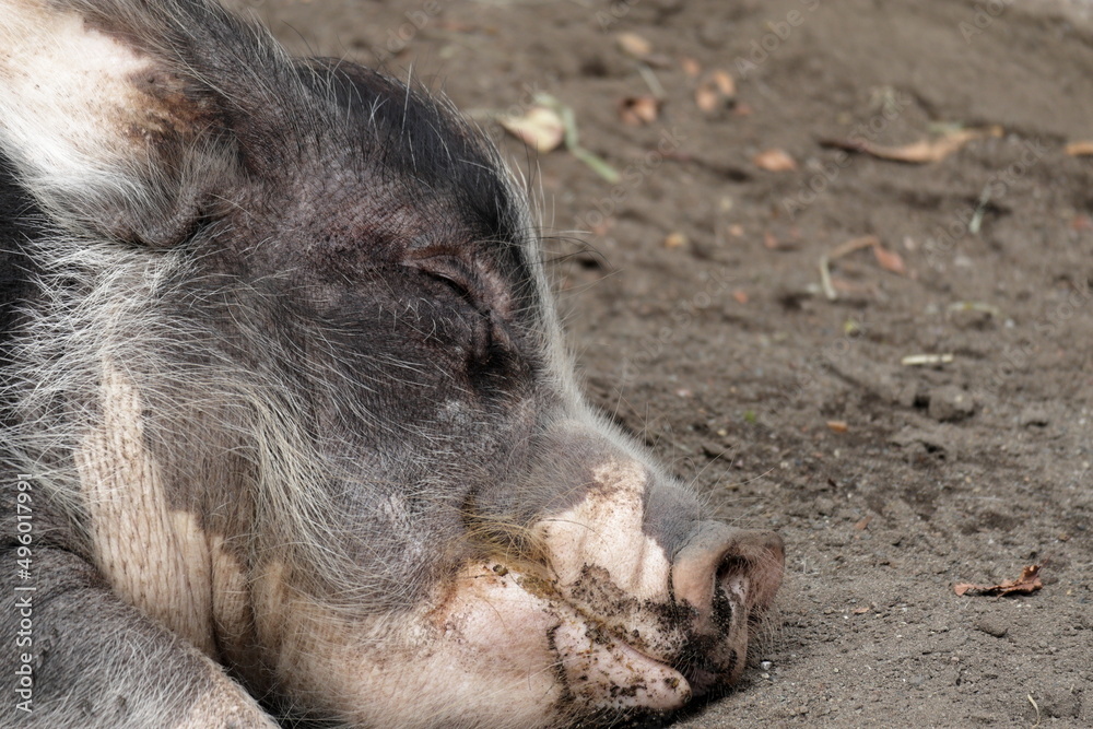 一匹の豚が寝ている。動物園で飼育されている豚。東京の郊外にある動物園にて。
