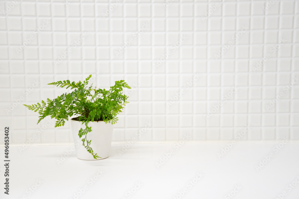 夏 白タイル背景 爽やか 観葉植物 コピースペース 白背景 余白 ホワイトスペース