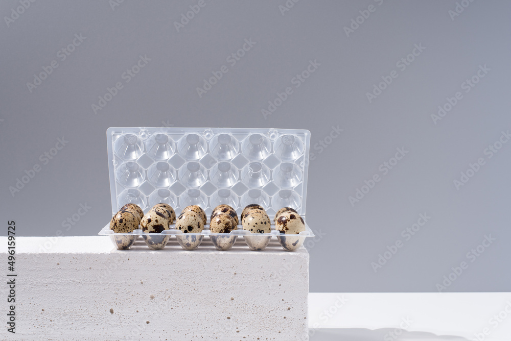 Huevos de codorniz dentro de una huevera sobre mesa blanca y sobre fondo gris