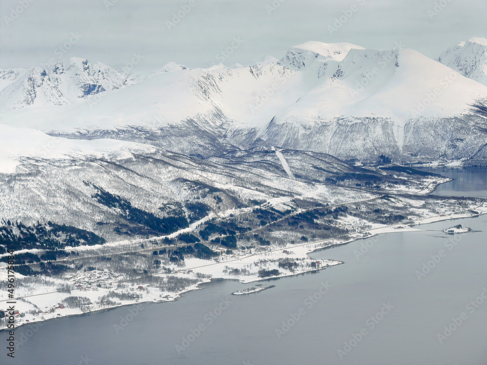 Aerial view of white snow covered city Tromso Norway winter, Snowscape wallpaper