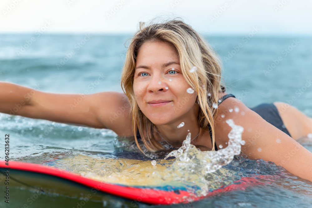 Close-up portrait young adult slim sporty female surfer girl enjoy swimming with surfboard ocean coast wave clear water on sunny day . Sport healthy carefree freedom lifestyle vacation concept