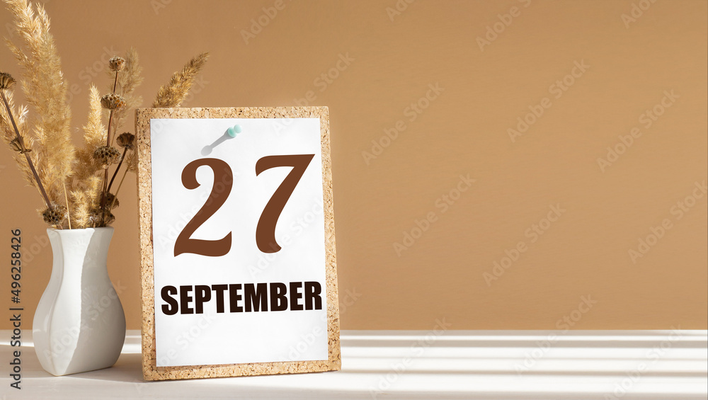 september 27. 27th day of month, calendar date.White vase with dead wood next to cork board with numbers. White-beige background with striped shadow. Concept of day of year, time planner, autumn month