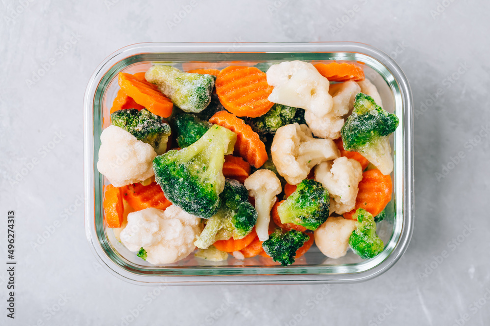 Frozen vegetables. Frozen carrots, broccoli and cauliflower in glass container on gray stone background