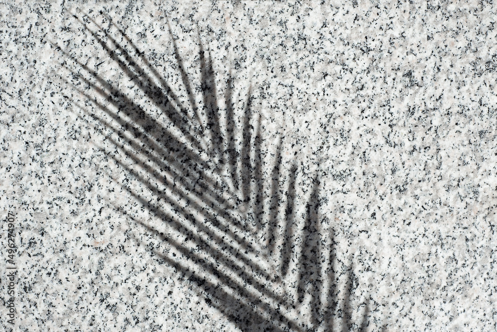 Trending concept in natural materials with palm leaves shadow on grey granite surface. Presentation with daylight. Natural blurred shade. Summer sunlight from herb. Abstract beautiful backdrop for