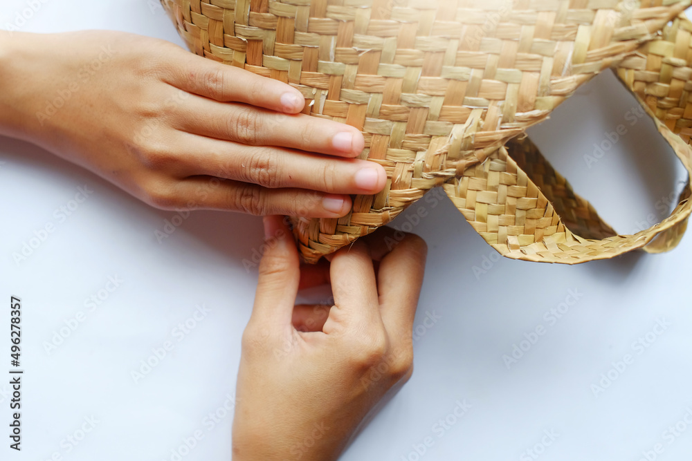 Woman holding a basket made of pandan leaves. Rural women use pandan leaves to make handicrafts to create value for local materials.